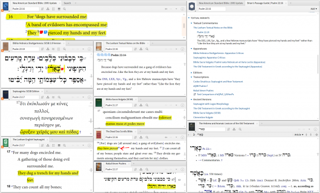 Instead, we use Logos Bible Software and the multitude of scholarly text-critical sources available within the platform. On a single screen, we can display multiple versions of the Hebrew Bible, synced to scroll with one another, alongside textual apparatuses and other books that discuss textual variants. Here is an example of having multiple resources all looking at the controversial textual variant on Psalm 22:16: